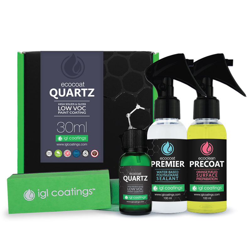 Svaki IGL Coatings keramički kit uključuje sve potrebno za aplikaciju keramičkog premaza: odmaščivač (Precoat), blok aplikator i suede, zaštitne rukavice i upute.